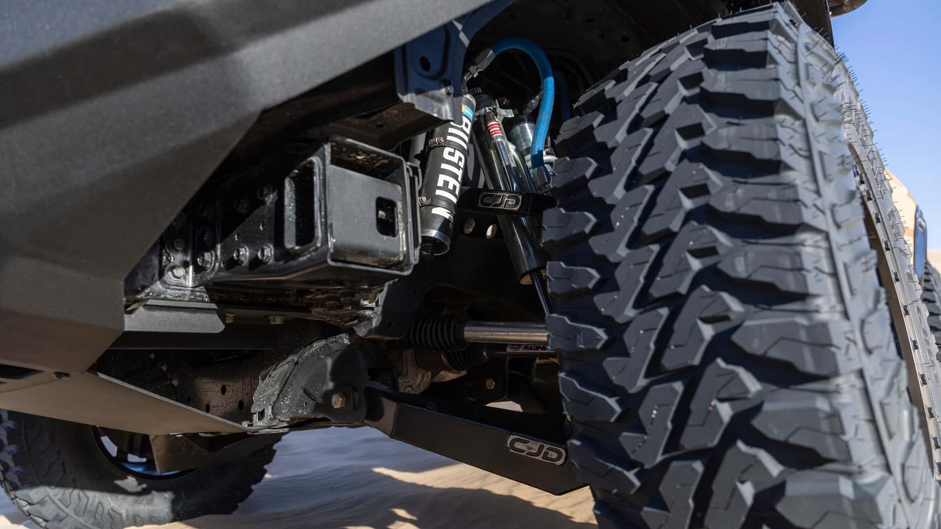 Dune Patrol 采用经过深度改装的悬架系统,搭载前后 10 英寸行程的 2.5 Bilstein M 9200 螺旋减震器、上下控制臂、传动轴、前主轴、拖曳臂及转向拉杆,并加装加长制动管线。由 CJD Racing 提供的长行程悬架可实现最高 406 毫米的悬挂活动范围。